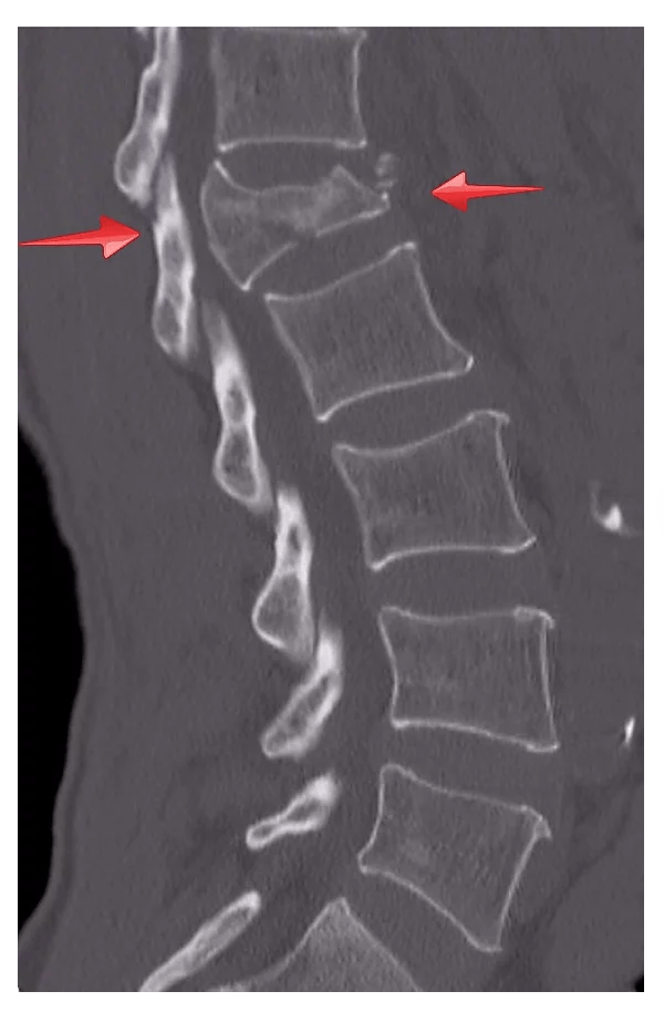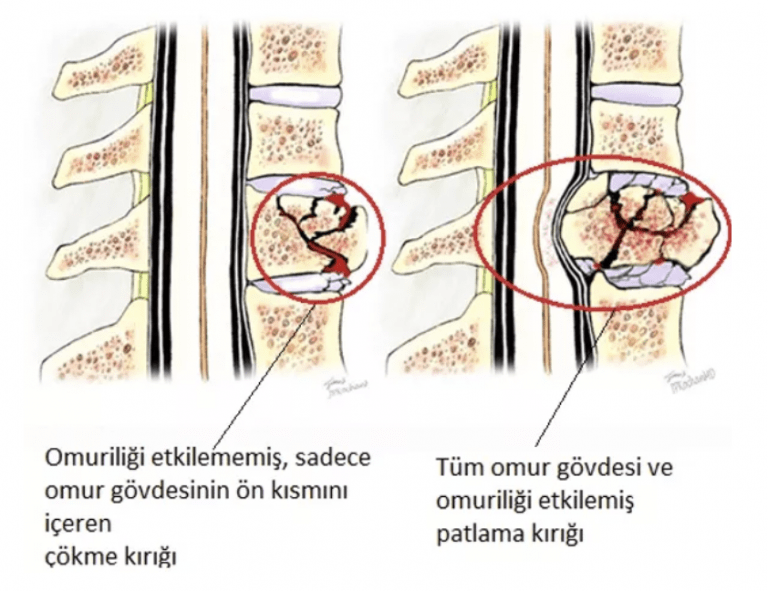 Kırıklar: Bir kemiğin üzerine dayanabileceğinden fazla yük binerse o kemik kırılır. En sık görülen tipi kırık omurun ön kısmının çöktüğü “çökme kırıkları”dır. Eğer omurga üzerine binen yük daha da şiddetli ise o zaman omurun orta ve arka kısmı da kırılabilir ve kırık parçaları omurilik kanalına doğru yer değiştirip omuriliği zedeleyebilir. Bu tip kırıklara da “patlama kırığı” denir. Patlama kırıklarında omurilik yaralanması ve felç sık görülmekle birlikte her patlama kırığı felce ya da omurilik yaralanmasına neden olmaz. Kırıklar genellikle tek bir omurda olmakla beraber %20-30 oranında ardışık veya ardışık olmayan birden fazla omuru da içerebilir.